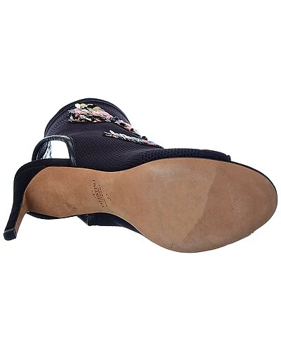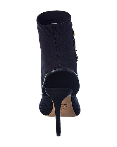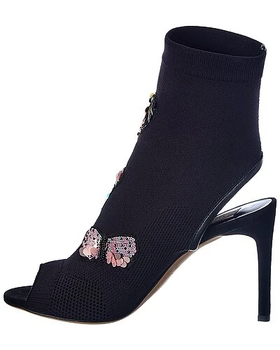 - Butterfly 90 Knit & Suede Bootie in black knit textile and suede with sequin embellishments and cutout back