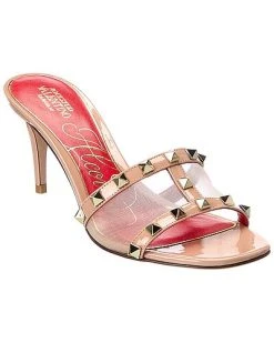 - Rockstud Alcove 65 Patent & Mesh Sandal in nude patent leather and mesh with platinum-finish rockstuds