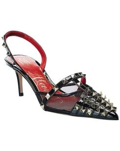 - Rockstud Alcove 65 Patent & Mesh Pump in black mesh and patent leather and gold-tone hardware with rockstuds