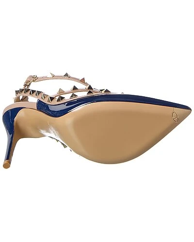 - Rockstud Caged 100 Patent Pump in navy patent leather with platinum-finish rockstuds and powder leather trim