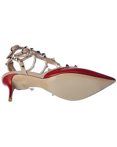 - Rockstud Caged 65 Leather Ankle Strap Pump in red leather with platinum-finish rockstuds and powder leather trim