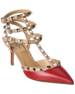 - Rockstud Caged 65 Ankle Strap Pump in red leather with platinum-finish rockstuds and powder leather trim