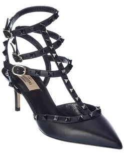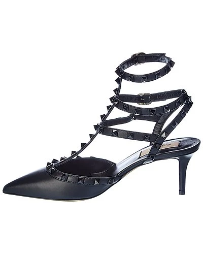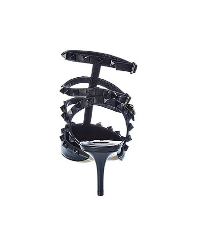 - Rockstud Caged 65 Leather Ankle Strap Pump in black leather and gold-tone hardware with rockstud trim