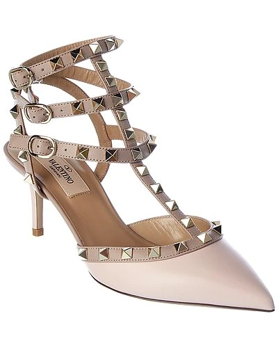 - Rockstud Caged 65 Leather Ankle Strap Pump in rose leather with platinum-finish rockstuds and powder leather trim