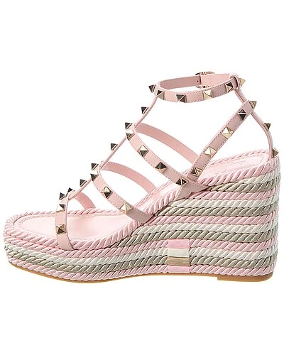 - Rockstud Caged 95 Leather Wedge Sandal in pink leather with metallic rope wedge and platinum-finish rockstuds