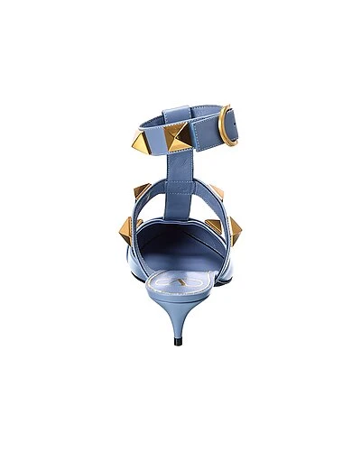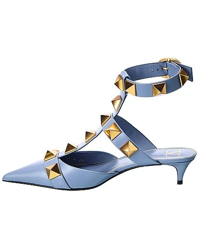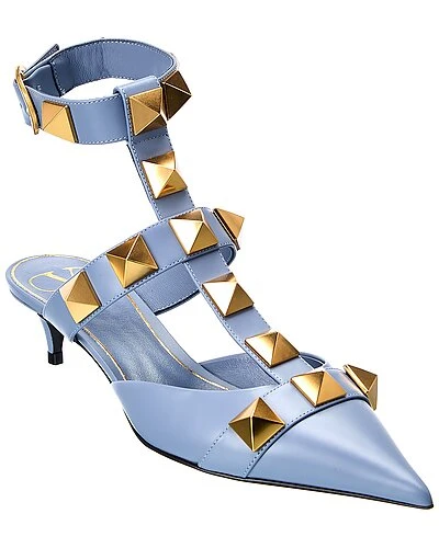 - Roman Stud 40 Leather Pump in blue leather and gold-tone hardware with Roman studs
