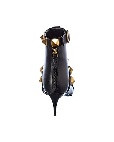 - Roman Stud 60 Leather Bootie in black leather and gold-tone hardware with Roman studs and buckle accent